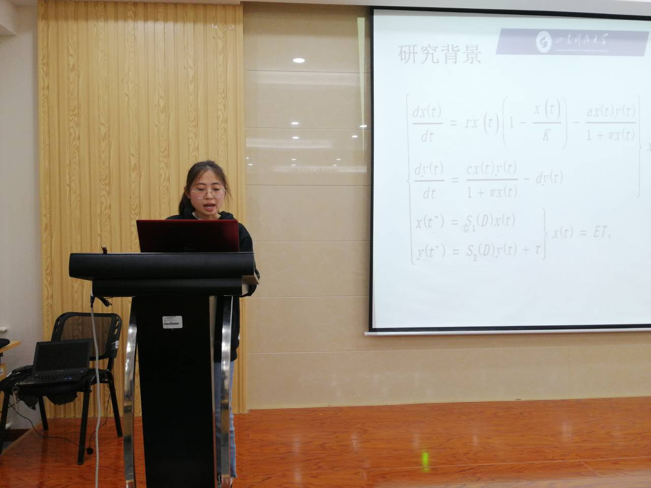 12月15日晚,数聚西海岸科学讲堂——研究生讲坛第126期在J9-433成功举办。必赢3003no1线路检测中心2019级应用数学硕士候晓雨作了题为“具有农药剂量作用和状态反馈控制的Holling II捕食-食饵模型”的报告。本次讲坛邀请的点评嘉宾是必赢3003no1线路检测中心程惠东老师。学院40余名研究生参加了此次讲坛,本次讲坛由科技部宋立凤主持。
