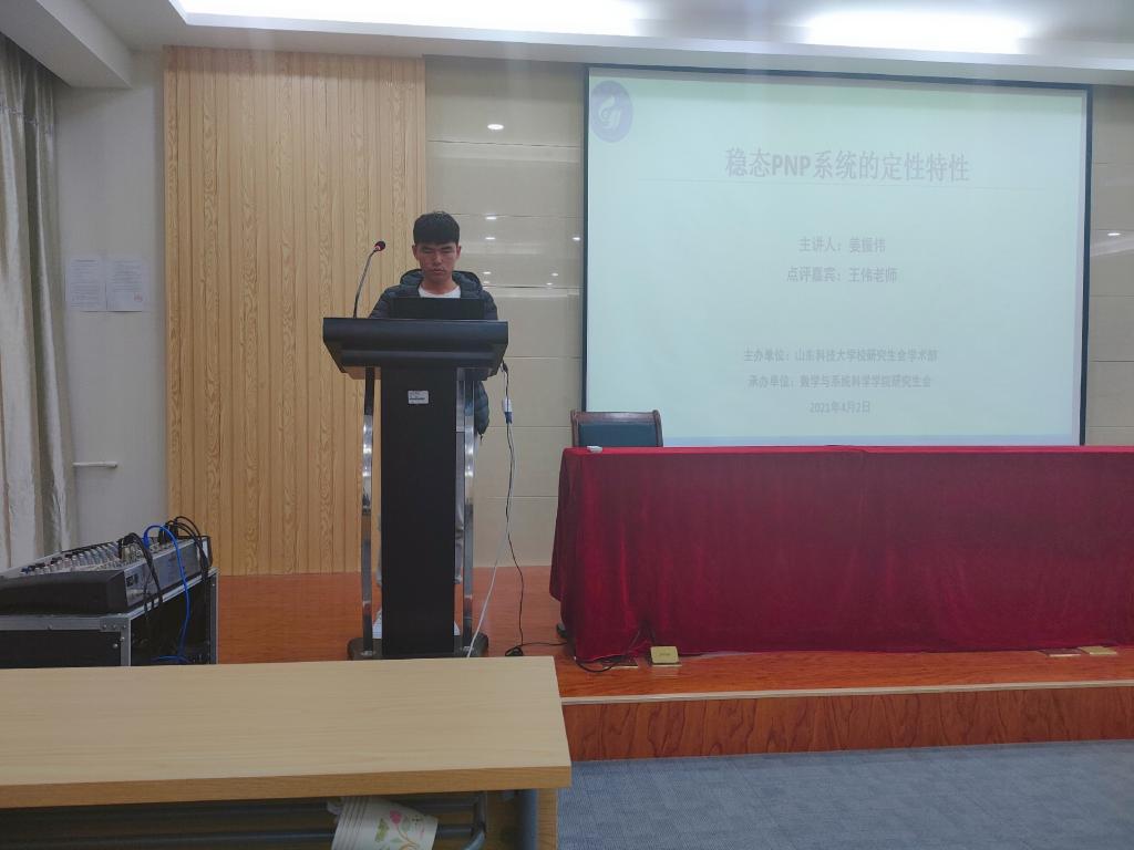 4月2日晚,数聚西海岸科学讲堂——研究生讲坛第137期在J9-433成功举办。必赢3003no1线路检测中心2020级数学专业硕士姜振伟作了题为“稳态PNP系统的定性特性”的报告。本次讲坛邀请的点评嘉宾是必赢3003no1线路检测中心王伟老师。学院50余名研究生参加了此次论坛,本次讲坛由科技部宋立凤主持。