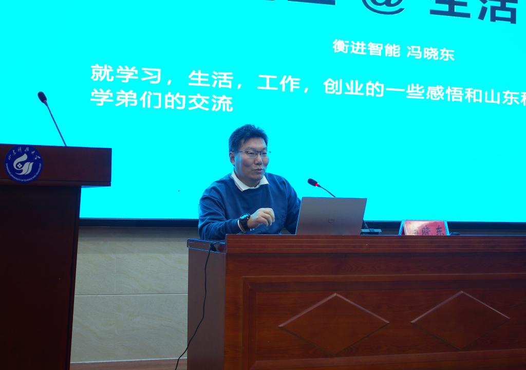 冯晓东从他个人的工作经历出发,通过幽默风趣的语言讲述了自己如何尝试多种职业,最后走上成功创业之路的故事,并结合自己多年的就业创业经历,向同学们提出了许多宝贵而实用的经验。他强调要终身学习,希望同学们把握好大学的点滴空闲时间,锻炼动手实践能力,多向社会靠拢,了解社会需求,为日后走向工作岗位打下坚实基础。同时,他也鼓励同学们要知难而进、越挫越勇,不能因为一次的失败就否定自己,她表示坚信思想决定行动,选择大于努力,只要坚持付出行动和努力,终会发生由量变到质变的效果。