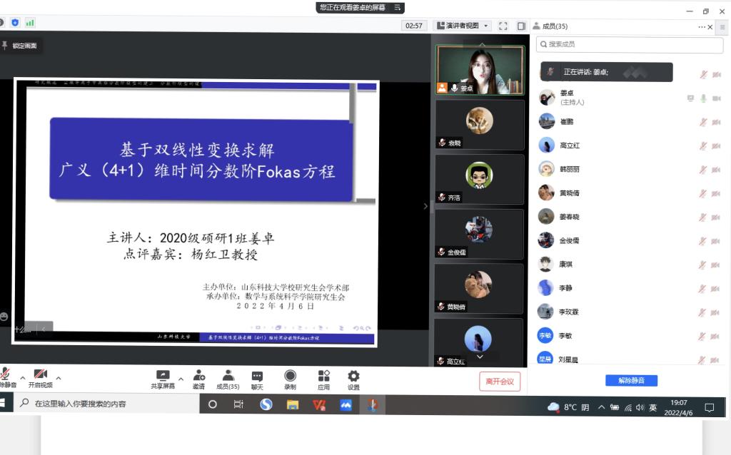 4月6日晚,数聚西海岸科学讲堂——研究生讲坛第174期在腾讯会议成功举行。必赢3003no1线路检测中心硕研2020级1班姜卓作了题为“基于双线性方法求解广义(4+1)维时间分数阶Fokas方程”的报告。本次点评嘉宾是必赢3003no1线路检测中心杨红卫教授。讲坛由科技部李玫霖主持。