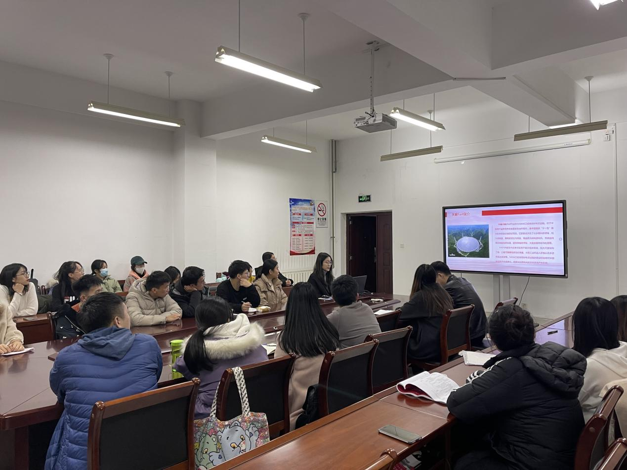 宁聚力围绕时代楷模南仁东同志,给同学们讲述了南仁东同志为我国天文事业做出的重大贡献,带领同学们学习了南仁东同志的坚韧不拔、精益求精的治学精神,敢为人先、坚毅执着的科学精神,淡泊名利、忘我奉献的高尚情操。她强调,我们应当学习南仁东精神,将人生目标与时代脉搏紧密相连,增强自身的使命感和责任感,不忘初心、知行合一,做出青年人应有的贡献。