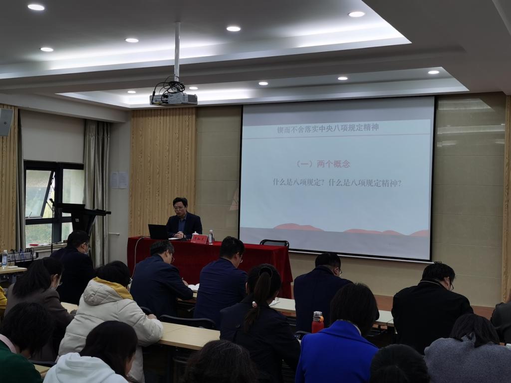周如东以“锲而不舍落实中央八项规定精神”为题,从理清中央八项规定和中央八项规定精神两个概念入手,围绕中央八项规定产生的背景、具体内容、禁止清单以及执行成效等方面,结合发生在高校违反中央八项规定精神的事例,结合工作实际,深入浅出地对中央八项规定精神进行了详细阐述。对大家关注的公务出行、公务接待、礼品往来以及婚丧喜庆等如何落实好中央八项规定精神进行了详细解读。