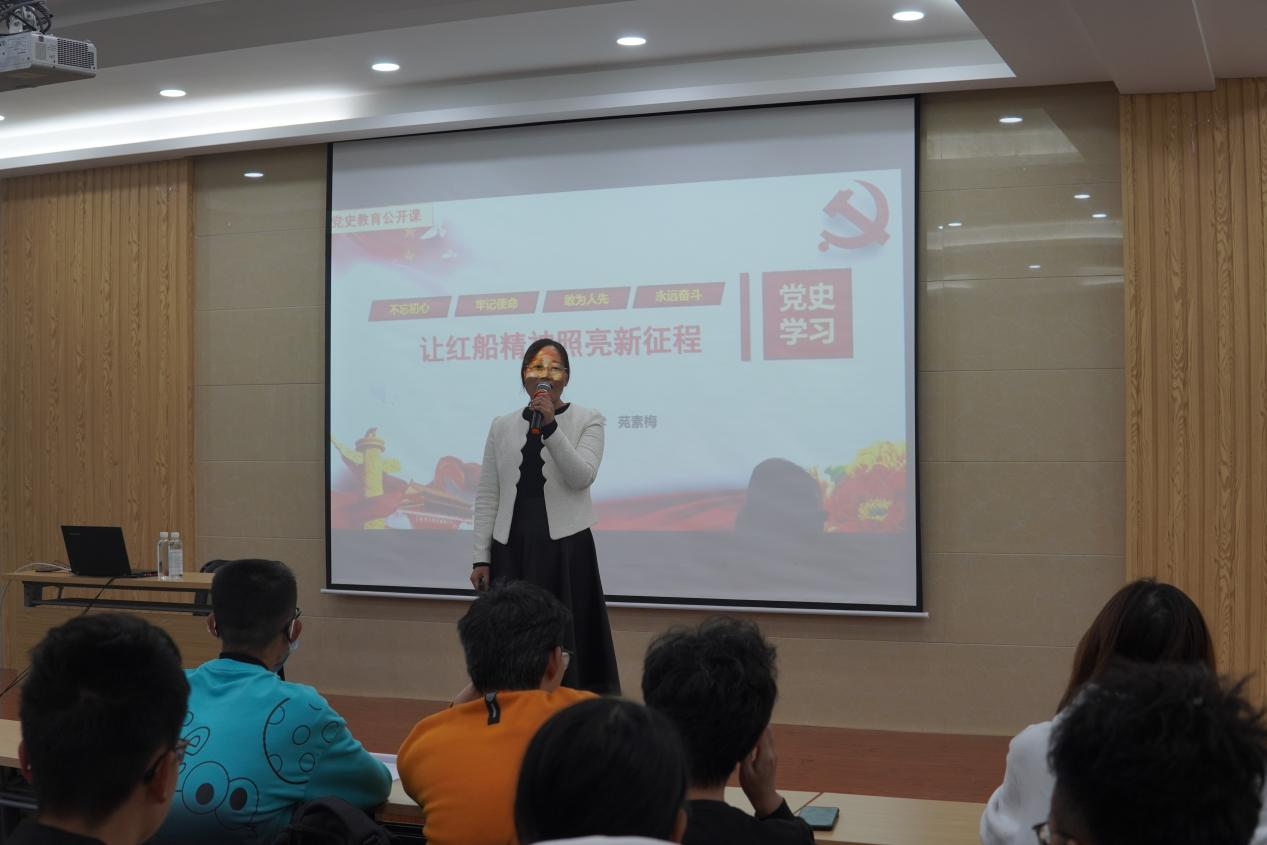 为进一步推进党史学习教育走深走实,凝聚大学生不忘初心、牢记使命,砥砺前行的精神力量。11月19日,马克思主义学院苑素梅副教授受邀在J9-433为我院“青马工程”基础班学员和2021级团支部委员培训班学员讲授“红船精神”。报告会由学院团委书记谢菲菲主持。