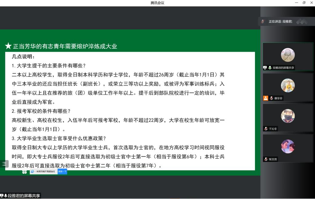 分享会结束后,分管学院国防教育工作的辅导员段雅君对大学生征兵入伍政策进行了详细解读。