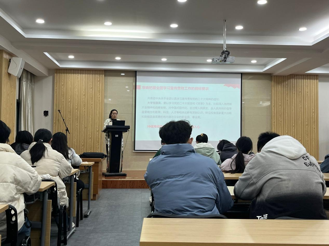 谢菲菲带领大家认真学习党的二十大报告和党章,对中国式现代化、全过程人民民主、全人类共同价值等重要概念和教育、科技、人才等相关论断作了重点介绍和解读。谢菲菲围绕学习党的二十大精神,结合工作实际,从共青团基础团务知识,团支部委员的素质、能力和作风要求及工作方向,活力团支部建设等方面详细地进行了讲解。