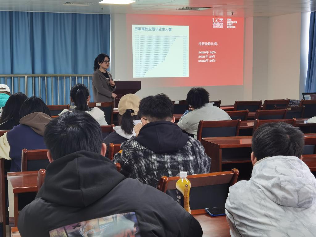 解俊向同学们介绍了新西兰坎特伯雷大学基本情况,介绍了新西兰留学项目的优势与特色,并就坎特伯雷大学与我校之间的合作项目及个人规划进行了详细讲解。交流讨论环节,解俊就学生提出的学期交流交换、3+1+1本硕连读、直升硕等相关问题进行了详细解答。