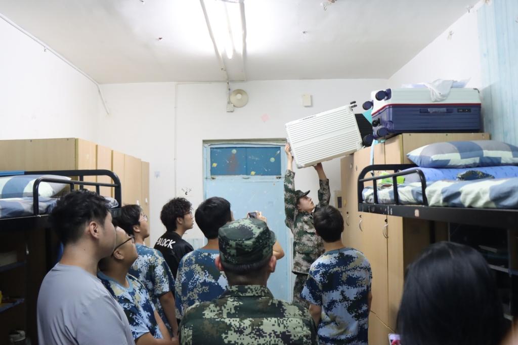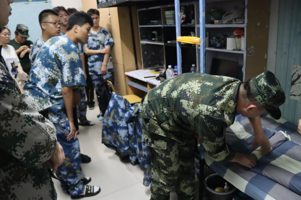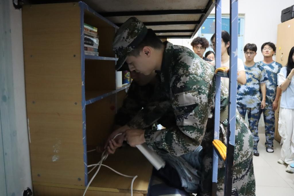 午后雨势未减,训练转战室内展开内务整理教学。教官以“一平一竖见作风”为主题,通过实物演示、分步讲解,将看似简单的叠被子拆解为“压、量、切、折、修”五步标准动作。新生们以宿舍为单位进行实操演练,辅导员逐一指导,将“直线与直角”的数学美感融入被褥棱角,将“分类与统筹”的数学思维运用于物品归置,让内务规范成为专业精神的延伸。