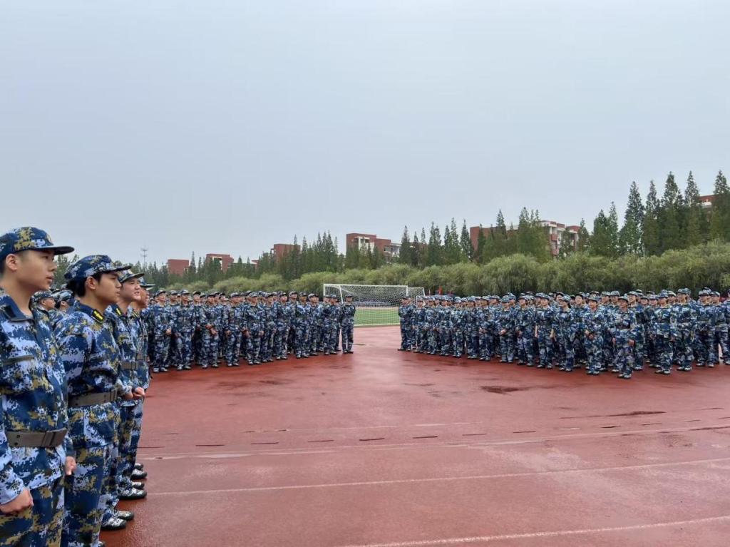 上午,细雨渐密,但新生们身着整齐,在教官的带领下准时列队操场。在简单的整队分列后,教官们代领新生学习《强军战歌》,“听吧新征程号角吹响……”嘹亮的歌声穿透雨幕,数百名新生以铿锵的节奏、激昂的旋律,将《强军战歌》演绎得气势如虹。