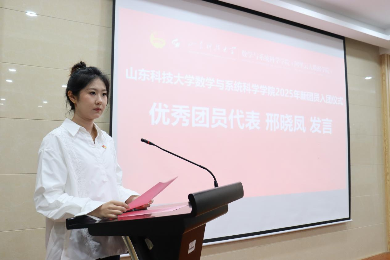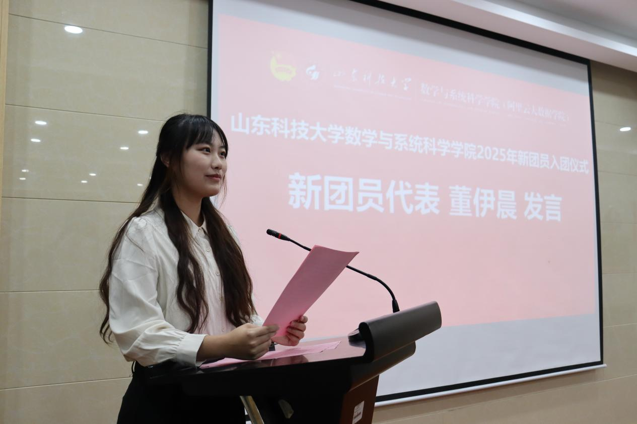 耿嘉蕾宣读了2025年下半年新团员名单并向他们致以衷心的祝贺。贾梓霆为新团员颁发团员证,葛天晨为新团员佩戴团徽。统计学2024级2班王睿超作为领誓人,引领全体团员面向团旗,高举右拳,庄严宣誓。