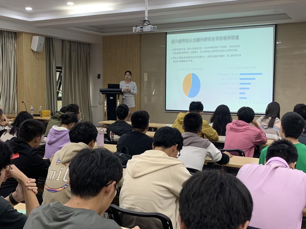 刘媛洁结合自身工作经历,对各国家院校申请入学时间、留学费用、语言要求等方面做了详细介绍,她鼓励同学们要积极参与国际交流,把短期访学和出国(境)读研作为高水平学术追求的一部分,通过交流开阔视野、结识朋友,为未来发展奠定良好基础。同时,刘媛洁结合学院目前出国(境)留学的基本情况,对国(境)外院校学习生活和就业前景等方面做了细致讲解,使同学们有了更加真切直观的认知。交流互动环节,同学们积极提问,刘老师耐心解答,现场氛围愉快融洽。