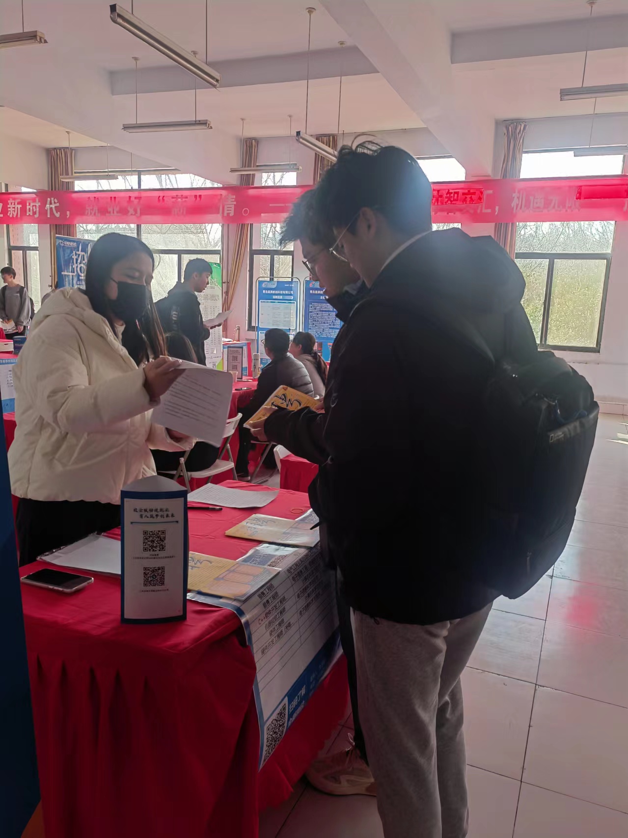 双选会现场,学生们在各招聘展位前认真查看岗位需求,介绍自身情况和专业特长,提交个人简历等求职材料,积极与招聘专员互动咨询,了解职业发展空间、薪资待遇等。