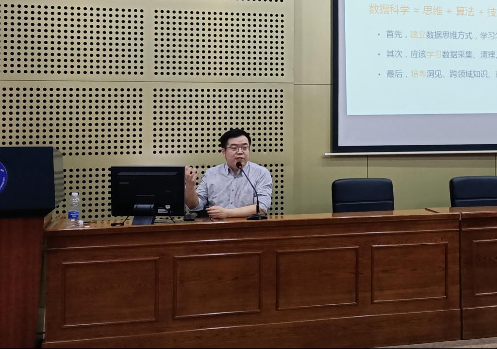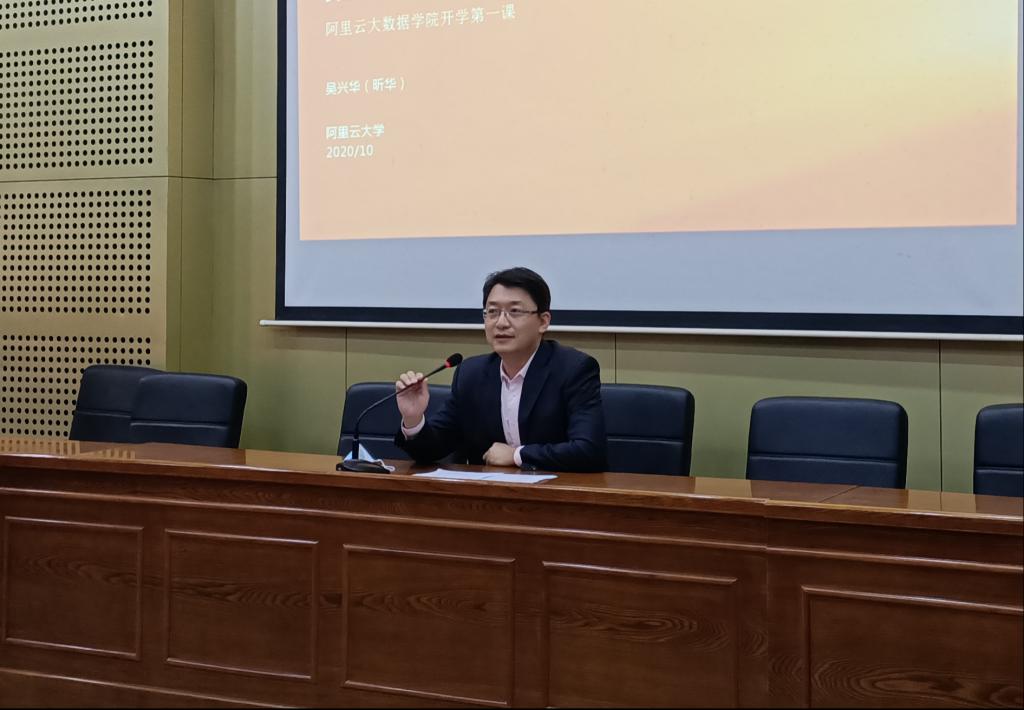 吴兴华从数据智能技术与产业发展、阿里巴巴与阿里云、大数据学院人才培养级产业人才需求解读等四个方面为同学们介绍了大数据行业和技术发展、岗位人才能力需求、所学专业与未来人才需求关系等内容。他建议同学们要树立“聪明、皮实、乐观、自省”八字人才观,珍惜当下时光,注重个人综合素养的提升。
