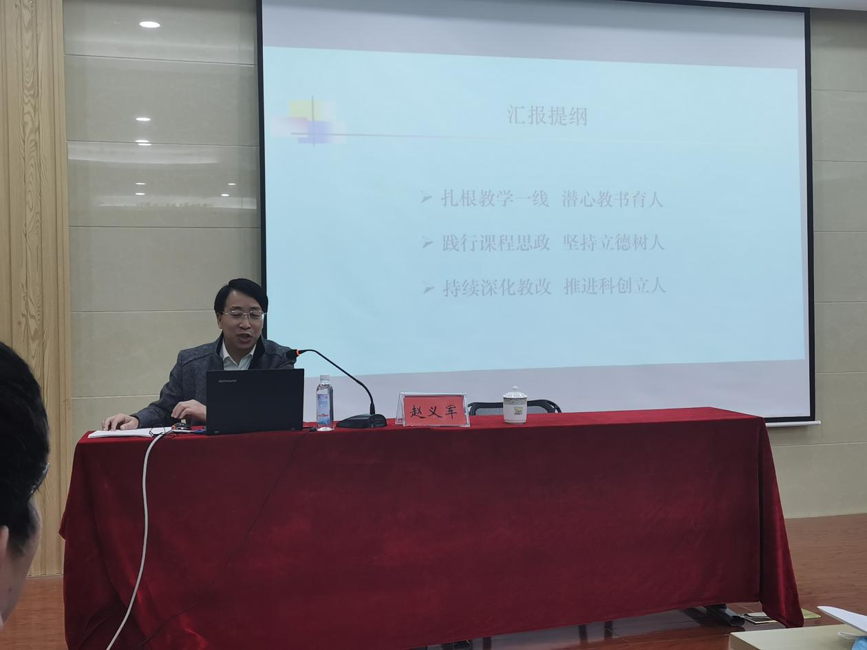 赵义军以“三十余年从教路,丹心一片育桃李”为题,从扎根教学一线、潜心教书育人;践行课程思政、坚持立德树人;持续深化教改、推进科创立人三个方面,对师德师风建设工作进行了系统、深入阐述,他用翔实的数据、丰富的实践案例引导广大教师弘扬高尚师德、潜心立德树人。赵义军提出作为一线教师要清正为师,廉洁从教,以高尚的人格魅力赢得学生的爱戴和尊重,担负起培养担当民族复兴大任的时代新人重任;其次,要践行课程思政,坚持立德树人,严于律己,严谨治学,师德为先,学教并重。他强调,既然选择了教师这一职业,就应该坚守初心,为国家育良才,为民族谋复兴,在平凡的教学工作中发出自己的光和热。