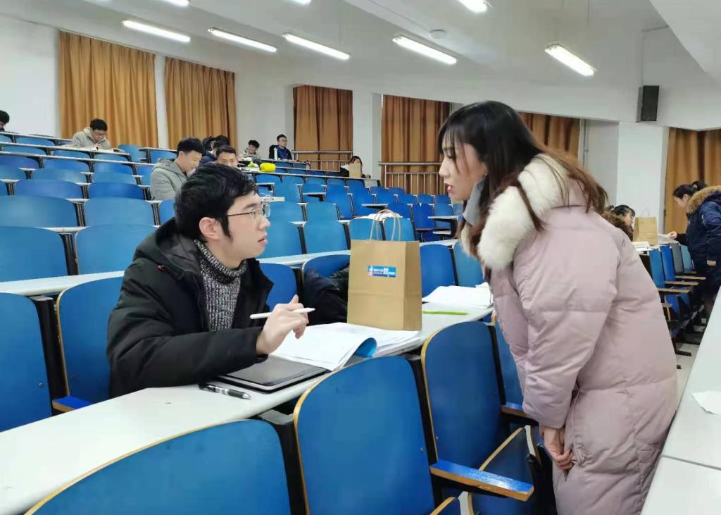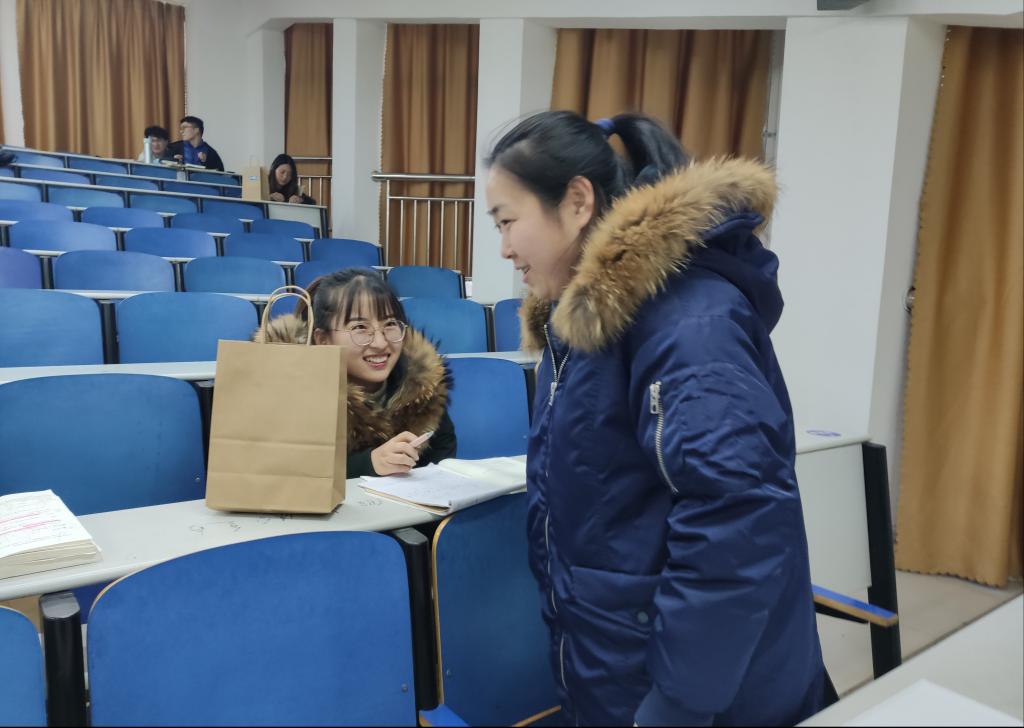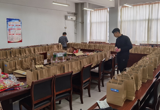 自习室里,辅导员们向备考学生一一送上了充满温暖的“考研大礼包”,鼓励考生要增强信心,持之以恒,顶得住压力,树立必胜的决心,同时也希望他们要学会调整心态,劳逸结合,保持乐观,不给自己过度施加压力。大礼包中的旺旺雪饼、橙子、仙贝、棒棒糖、牛奶及考研时间提示卡,寓意着“旺”你 :“雪”业有“橙”、考试“贝”“棒”、“牛”气冲天!