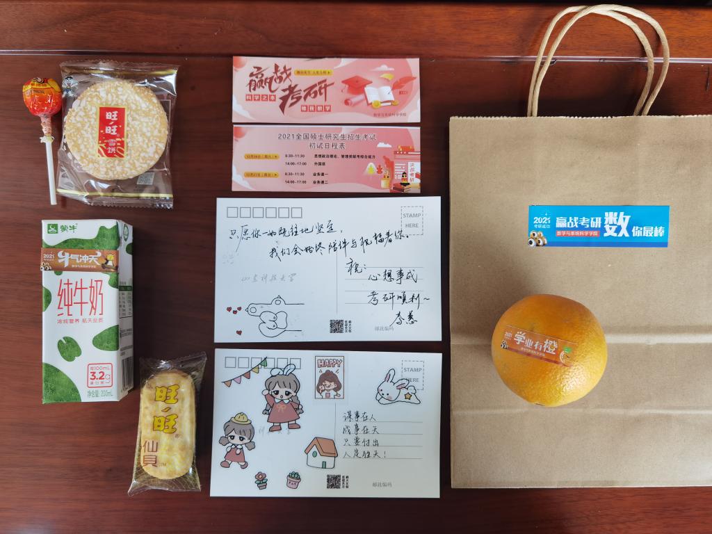 除考研礼包外,学院还开展了录制“助力考研梦”加油小视频、发布考研温馨提示及老师手写科大明信片送学生等活动,鼓励和祝福考研学子旗开得胜。备考学子们纷纷表示,学院的关爱是对他们最好的鼓励,在接下来的学习中将带着学院和老师的期望倍加努力,以优异成绩回报学院。