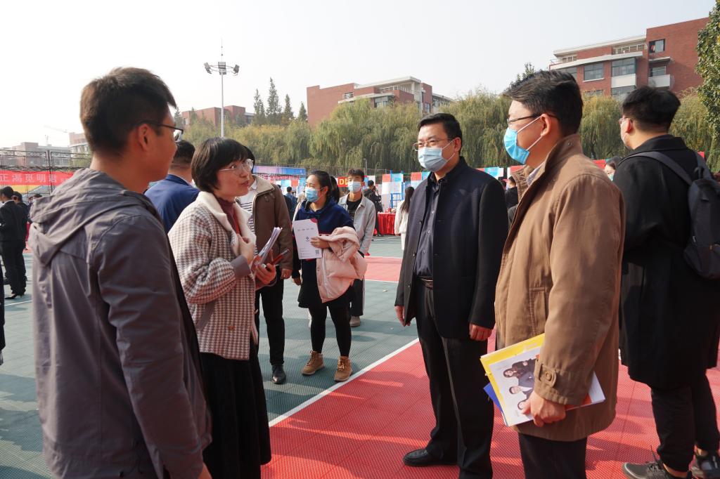 11月7日,“多彩校招”山东省2020年高校毕业生集中招聘活动暨必赢3003no1线路检测中心秋冬校园双选会在学校排球场举行。必赢3003no1线路检测中心党委书记徐明磊、党委副书记兼副院长刘辉、团委书记谢菲菲及各年级辅导员到现场交流参观。