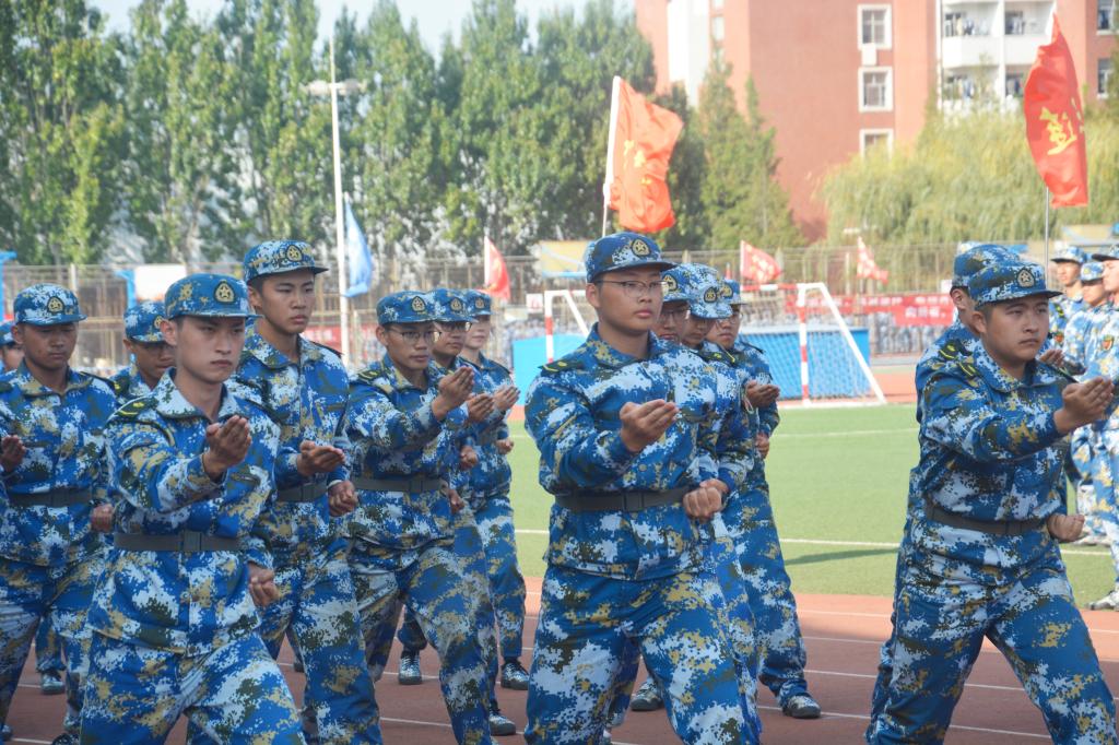 伴随着庄严的国歌响起,八营会操表演由此拉开序幕,经历军训艰苦磨炼的同学们在教官的指令下以饱满的精神展示了四面转法、齐步走、正步走、跑步走以及擒敌拳等基本军事科目。嘹亮的口号,整齐的步伐,精神抖擞的同学们用自己的行动展示了两周的训练成果,赢得了领导老师们的一致好评。十几天的军事训练,使同学们稚嫩的面容上多了份沉稳与坚毅,英姿飒爽的身影里,彰显了同学们对未来生活的期待与自信。