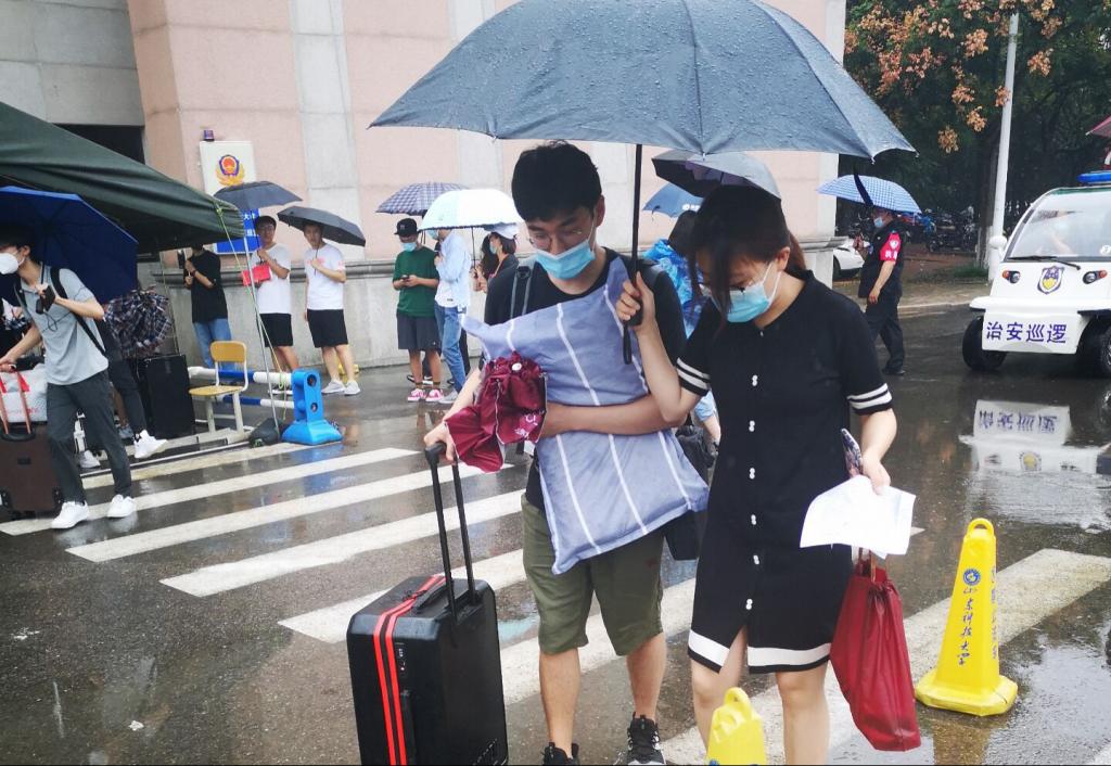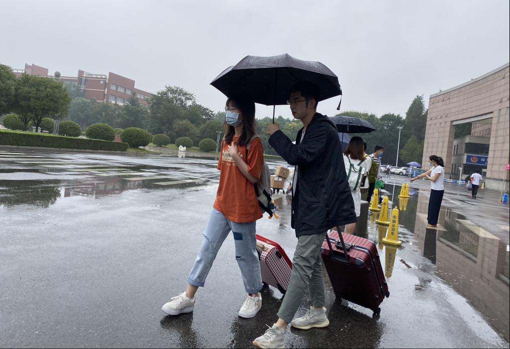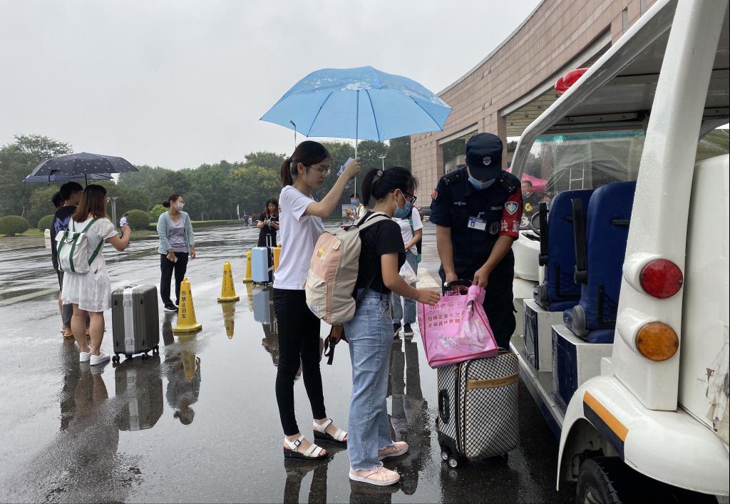今年的开学季似乎和雨水特别有缘。自返校起,连续两日数千名学生迎着秋雨回到校园,在工作人员的指引下,返校学生通过行李消杀、核验身份及体温测量等流程后,顺利进入校园。