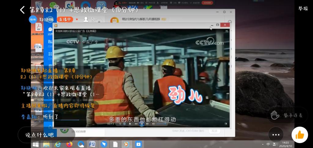 统计系周绍伟、郑艳林等老师在微课堂中表示,疫情防控,充分彰显了中国特色社会主义制度的显著优势,作为大学生,要全面贯彻坚定信心、同舟共济、科学防治、精准施策的总要求,自觉做好个人防护,遵守“戴口罩、勤洗手,不出门、不聚会,不恐慌、不传谣,出远门、要隔离,有异常、要上报”的承诺,理性冷静,保持良好心态,为身边亲人和好友做出良好示范。系统科学系李艳艳老师也引导学生要珍惜时光,把握现在,合理安排好居家的学习和生活,从自律做起,按时完成学习任务,实现作息时间的规范化,抓好弯道超车的机会,塑造更完美的自己。