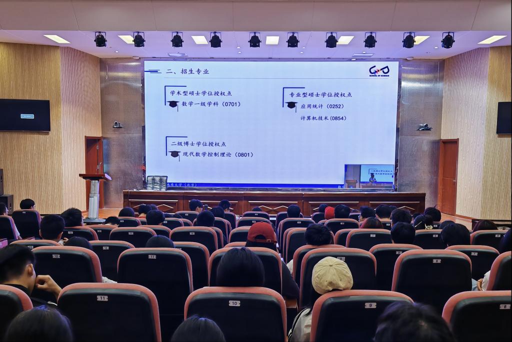 与会专家分别从学院概况、师资力量、科研平台、学科和特色团队、历年硕士招生、奖助学金政策、个人未来发展及就业等方面进行详细介绍,分析了数学在不同领域中的应用。他们鼓励同学们要保持对数学的热爱和激情,积极参与跨学院、跨学科的项目团队,瞄准科技前沿和关键领域深入开展多学科交叉研究,助力学校高水平建设。分享结束后,与会专家与师生进行了深入的交流和讨论。