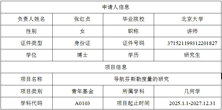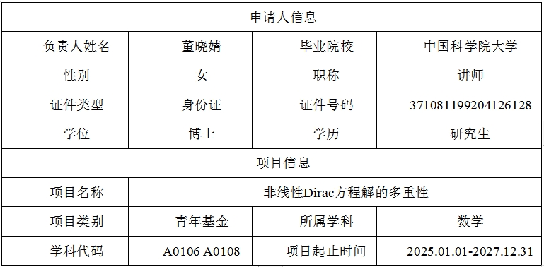 经资格审查,必赢3003no1线路检测中心 数学与系统科学学院 张红贞、董晓婧、周璇 老师满足申报要求、证明材料完备,符合山东省自然科学基金“直接给予”政策,相关信息公示如下: