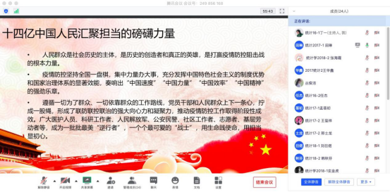 田琳以“疫情防控中彰显党和人民的担当作为”为主题,通过孙如彬等一些在疫情防控中的优秀共产党员事迹,向大家讲述了中国共产党和人民群众在疫情防控中的担当作为,体现了中国的大国担当。她表示,我们大学生在疫情期间,更应该积极学习,珍惜在家陪伴父母的日子,对自己和家庭负责,科学防护,不信谣不传谣,对社会负责。用自己的力量为战疫献力!
