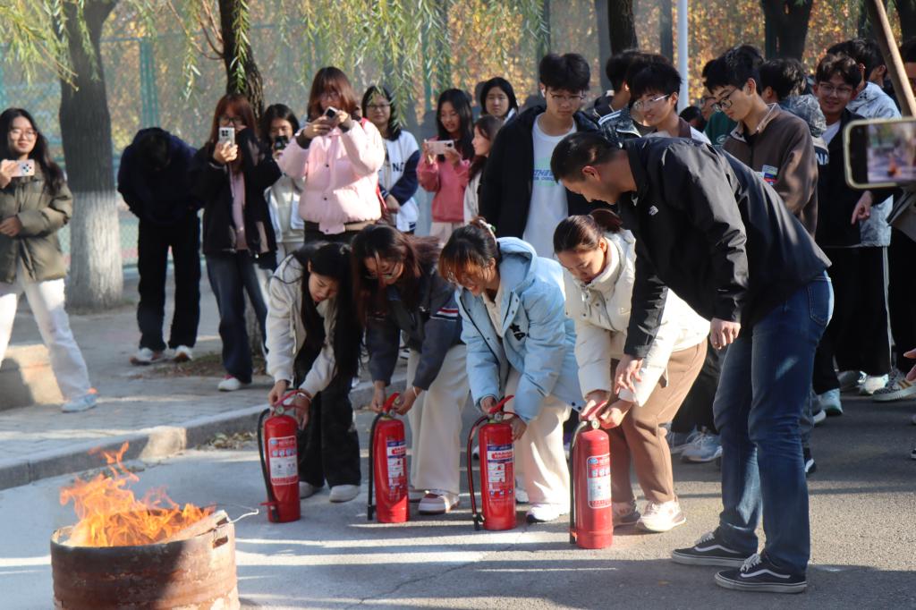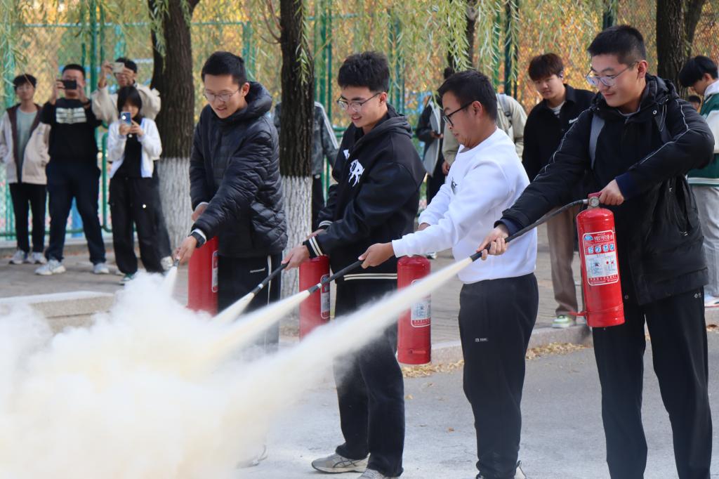 活动中,邵老师详细解读了校园火灾的高发时段、场所及应对策略,并重点强调了扑救初起火灾的重要性,讲述了各类灭火器的适用场合及操作技巧。随后,学生们被分成4人一组进行了实战演练,学习干粉灭火器的使用方法、操作流程及注意事项,并亲手操作进行了灭火演练。整个演练过程安全、有序且组织规范。