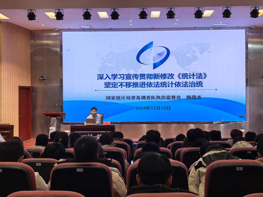 为持续落实“八五”普法规划要求,切实提升在校大学生法治意识和法治素养,进一步推进法治校园、文明校园建设,12月10日下午,必赢3003no1线路检测中心于J9-144报告厅举办普法宣讲活动,邀请国家统计局青岛调查队与国家统计局青岛西海岸新区调查队针对新修改的《中华人民共和国统计法》进行宣讲。