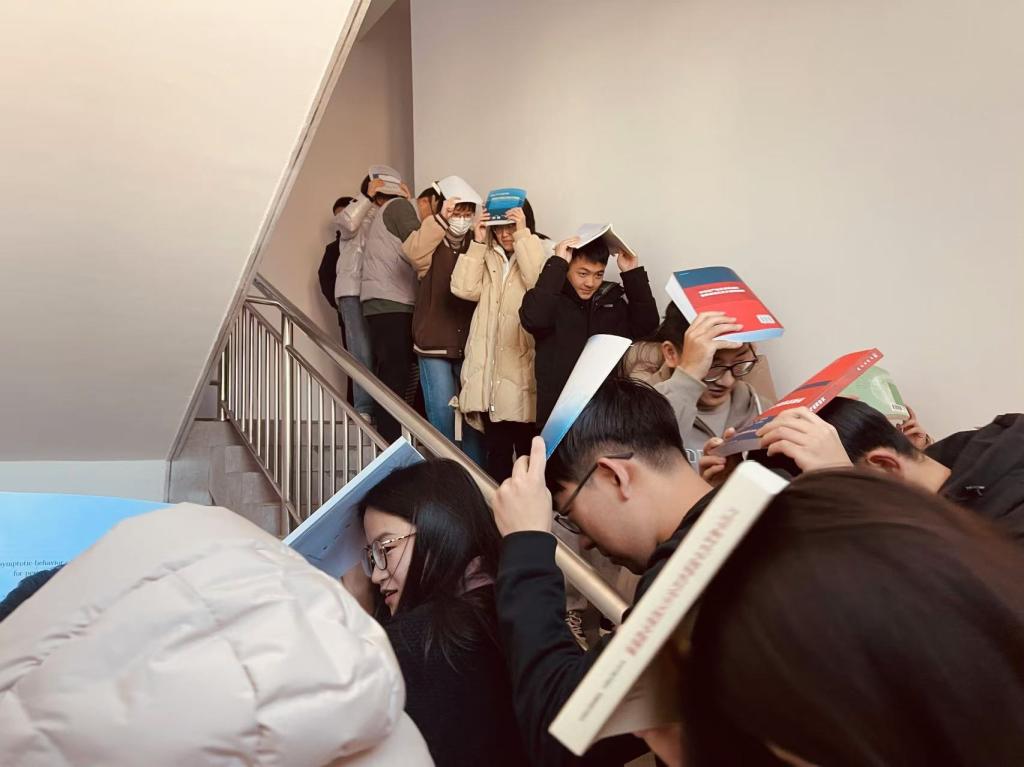 随着演练正式开始,各楼层的安全员根据预先制定的疏散计划,迅速到位,引导学生沿着指定路线快速撤离至集合点。整个过程中,学生们保持冷静,在安全员的带领下有条不紊地完成了疏散任务。