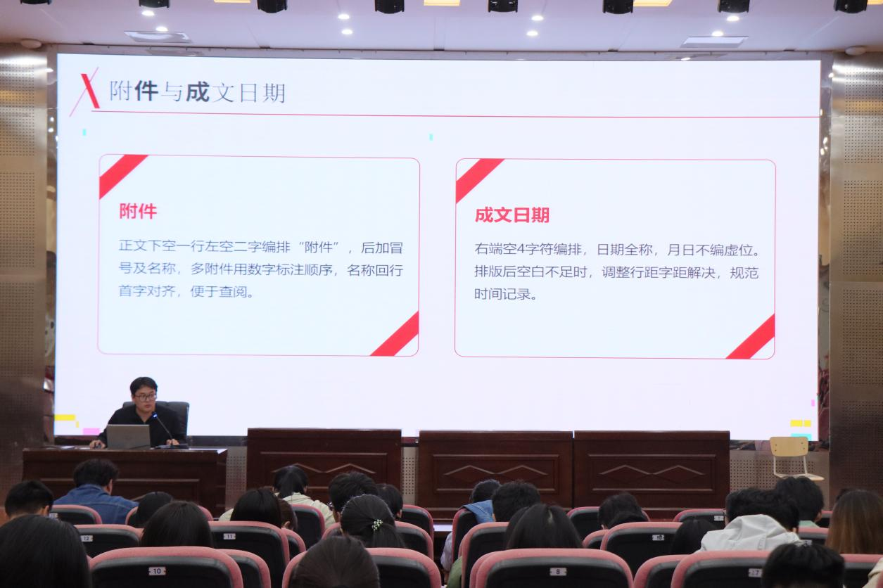 贾梓霆主讲 “学生工作常用文书规范” ,他强调,规范的文书不仅能精准传达工作意图,还能提升学生工作团队的公信力,学生干部要学习文书规范,做到心中有 “尺”;谋篇布局,确保条理清晰;精雕细琢,反复打磨文书内容。